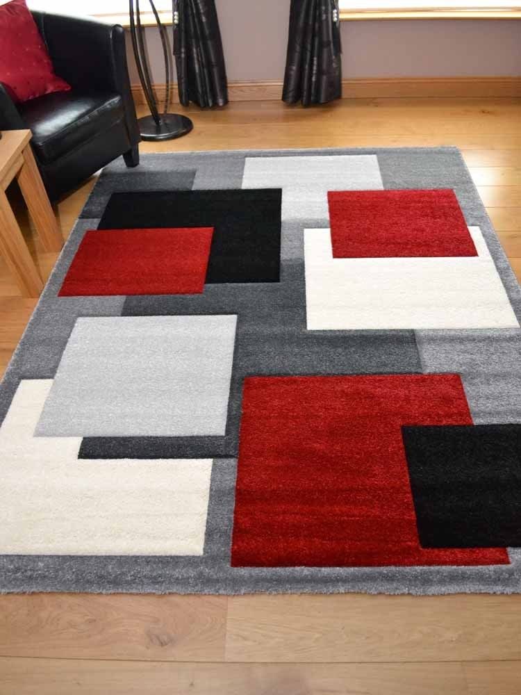 This contemporary Tempo Square Design Rug beautifully combines Red, Silver, Grey, Cream and Black. The 100% Frise Polypropylene pile is thick, soft and will be a warm addition to your room. The surface is carved by hand to add a subtle 3D textured effect, that will add vibrancy and comfort. Produced on State-of-the-art Wilton looms and with Hessian backing, this rug is also highly durable, being both stain and fade resistant.